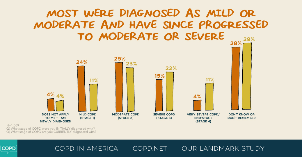 Many respondents did not know the stage of their COPD when they were diagnosed, nor do they know their current stage. This could be because studies show there is a large gap in communication between physicians and their COPD patients.